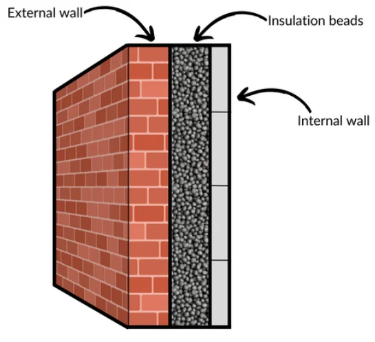Diagram shown external and internal walls with the cavity wall insulation beads installed in-between